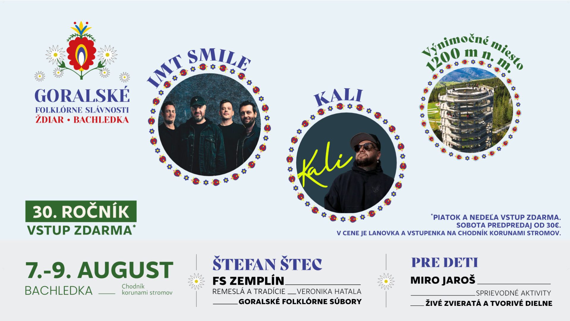 Na Bachledke, v nadmorskej výške takmer 1200 m n. m., vystúpia IMT Smile, KALI, Štefan Štec, Miro Jaroš a FS Zemplín ako hostia veľkolepej oslavy goralskej kultúry.
