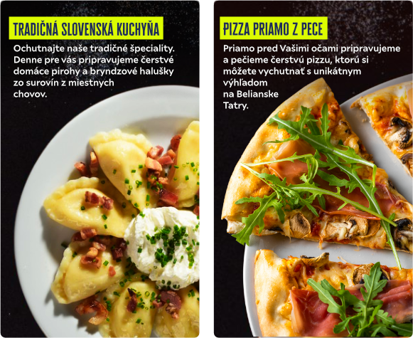 Denne pre Vás pripravujeme čerstvé dobroty z lokálnych surovín. Poznáte lepšiu chuť, ako čerstvé plody lesa? Výrobky z mlieka oviec a kráv pasúcich sa na horských lúkach, mäsa z domáceho chovu a to všetko dochutené bylinkami, ktoré denne kropí rosa a horské slnko im dodáva plnú chuť a vôňu?